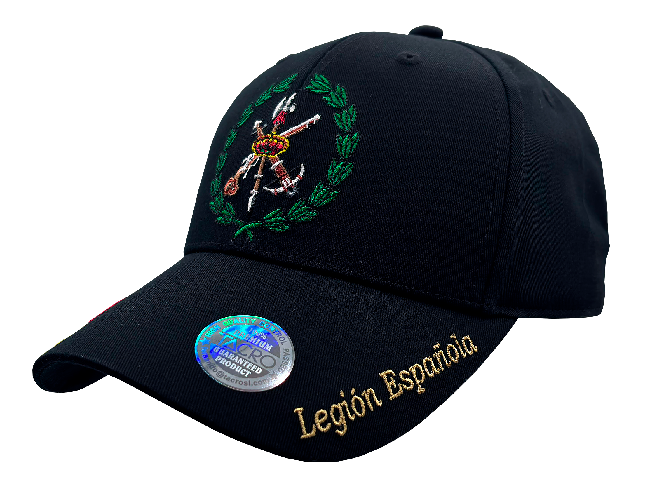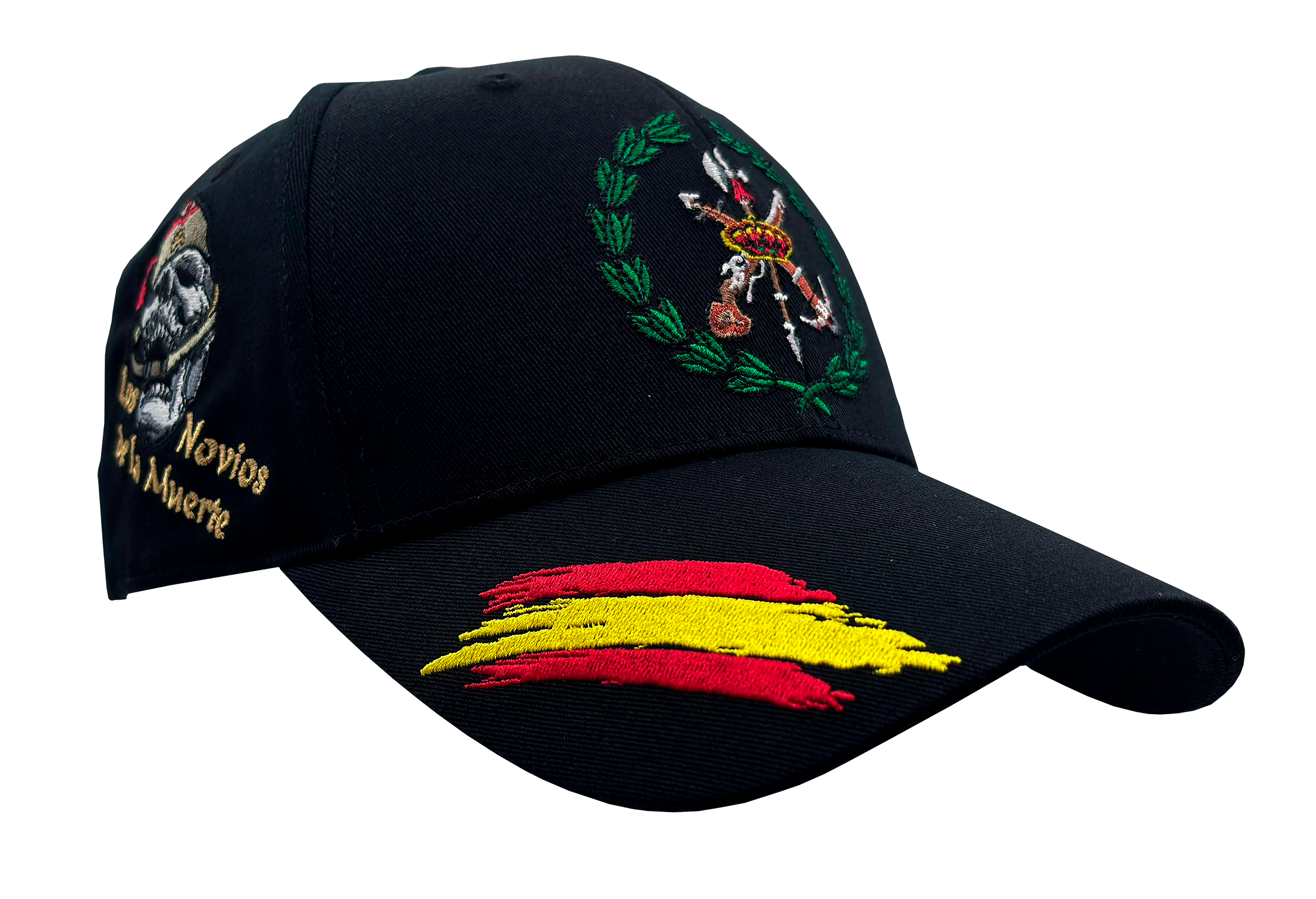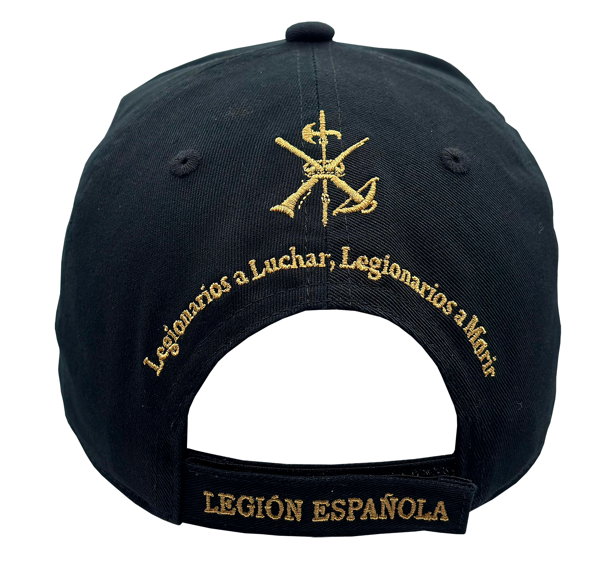 - DISEÑO EXCLUSIVO: Gorra oficial de la Legión Española en color negro con bordados en color arena, presentando emblemas tradicionales y símbolos distintivos