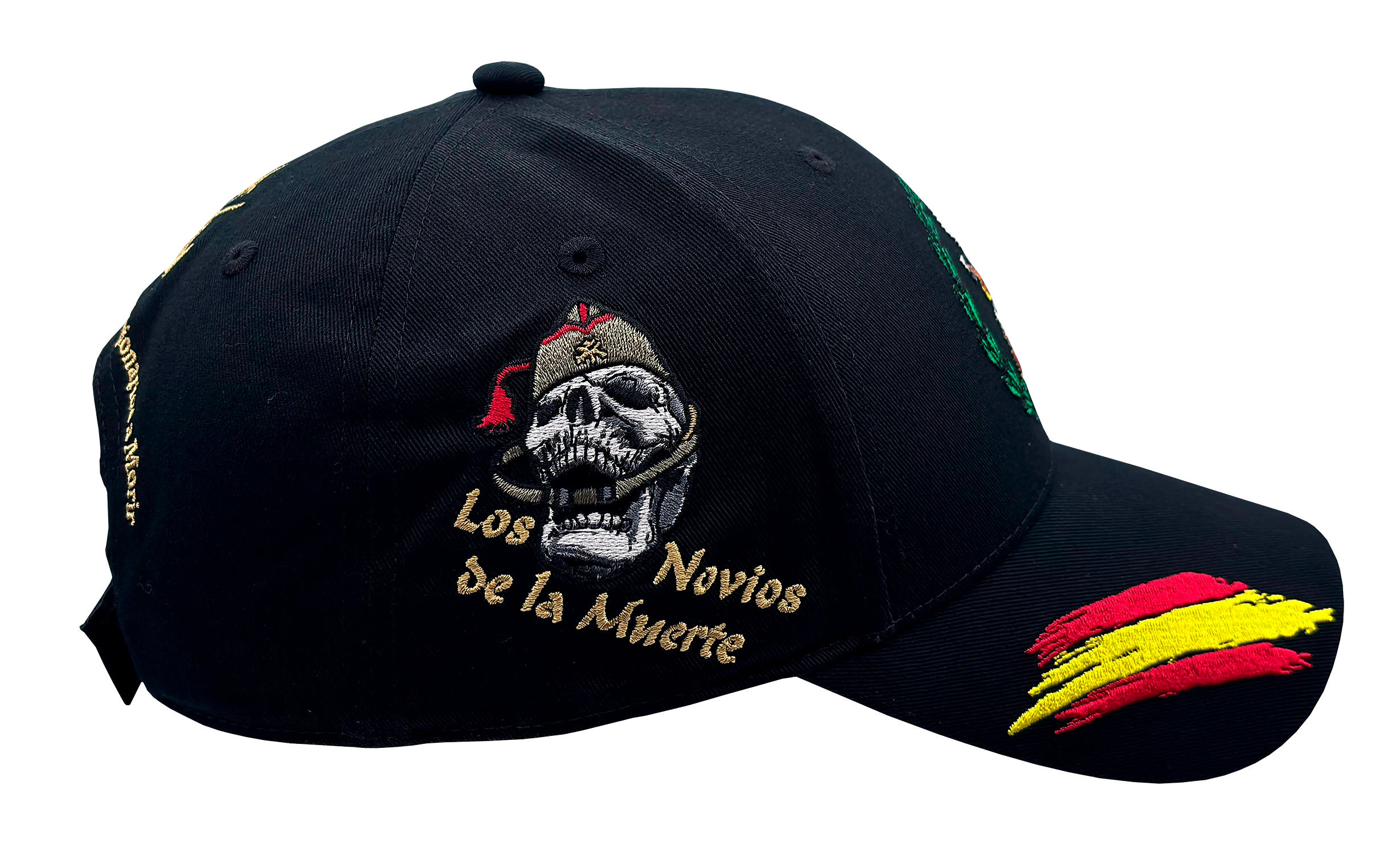 - DETALLES BORDADOS: Incluye el emblema de la calavera 'Los Novios de la Muerte', logo central con corona y laureles, y texto 'Legión Española' en dorado